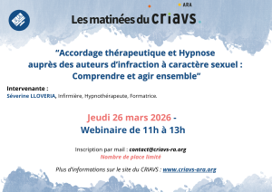 Webinaire : les matinées du CRIAVS : “Accordage thérapeutique et Hypnose auprès des auteurs d’infraction à caractère sexuel : Comprendre et agir ensemble” – Séverine LLOVERIA
